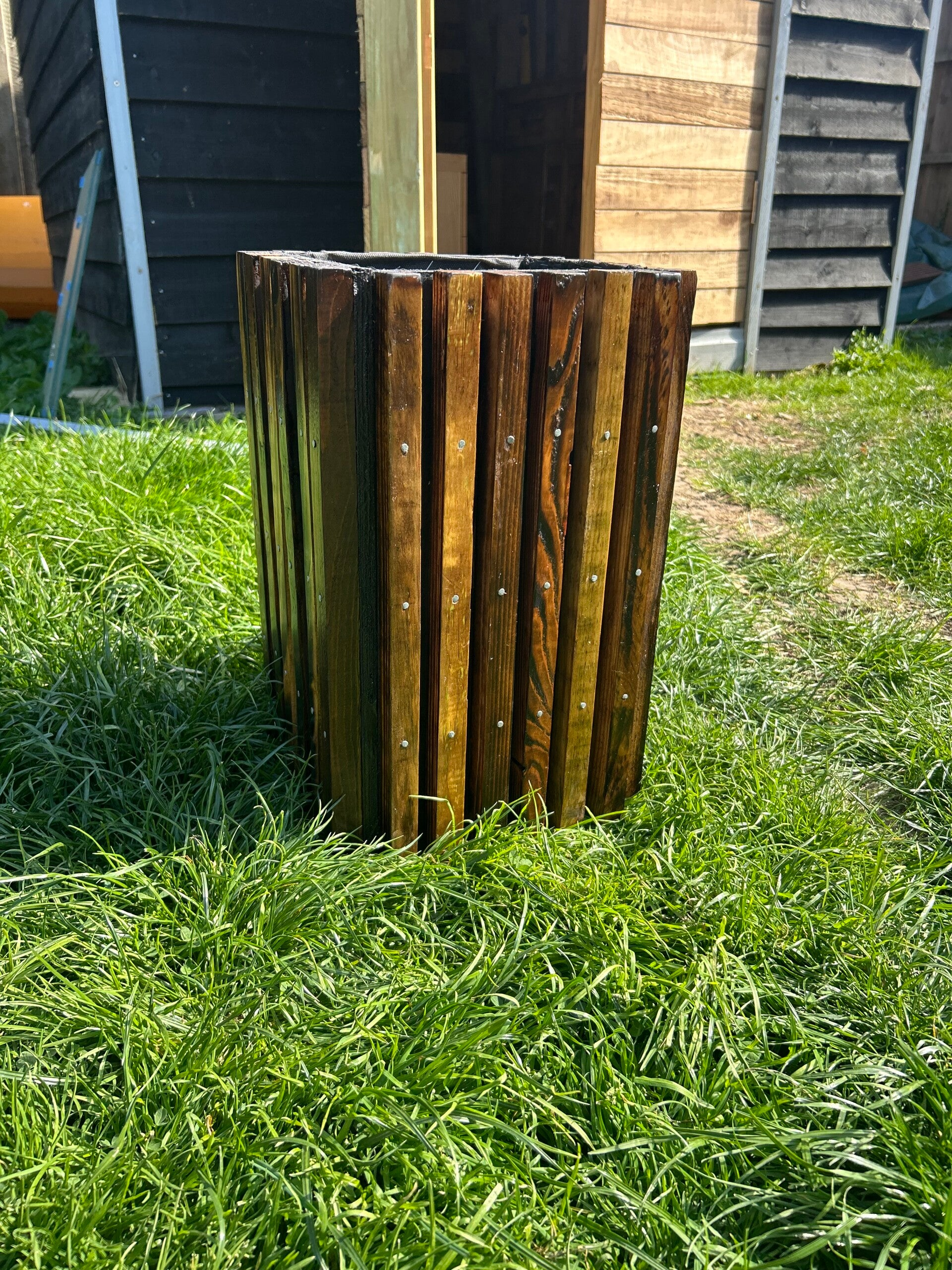 This striking planter is modern yet slightly rustic with a black box planter with 20mm burnt wood pieces nailed on around the box to give a modern texture and look which compliment the black box.